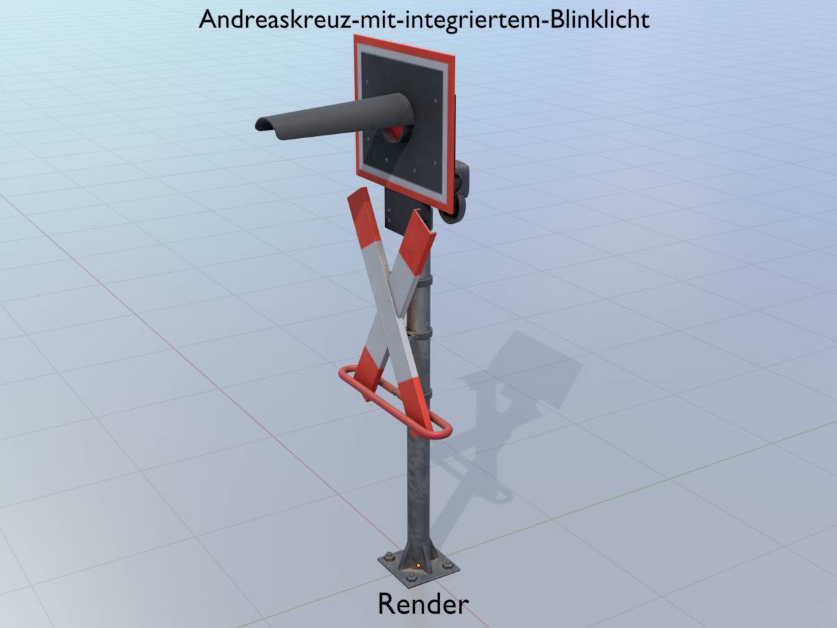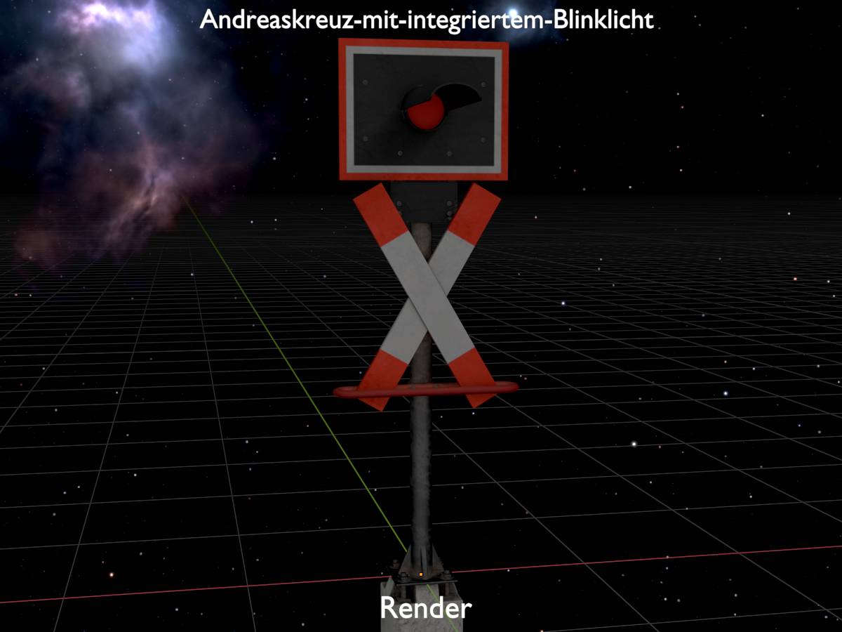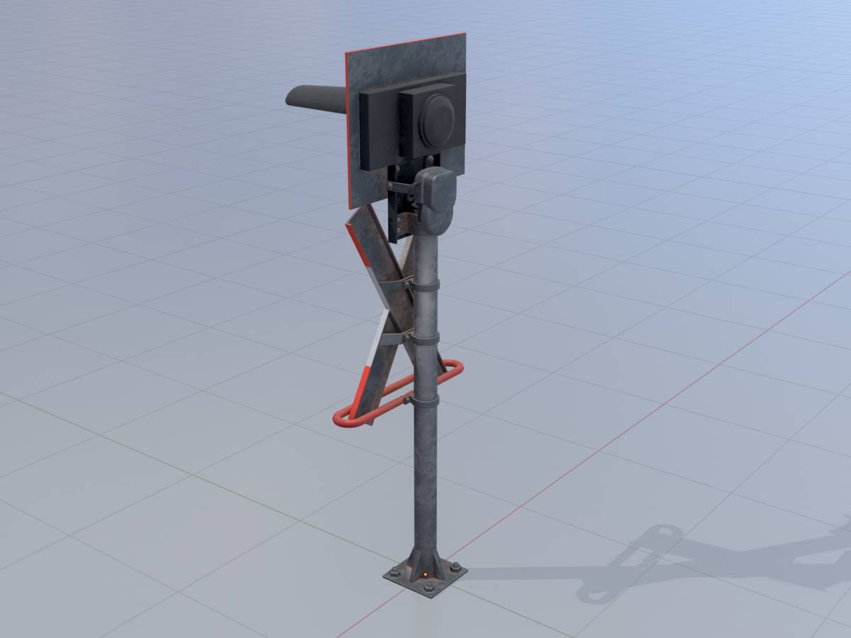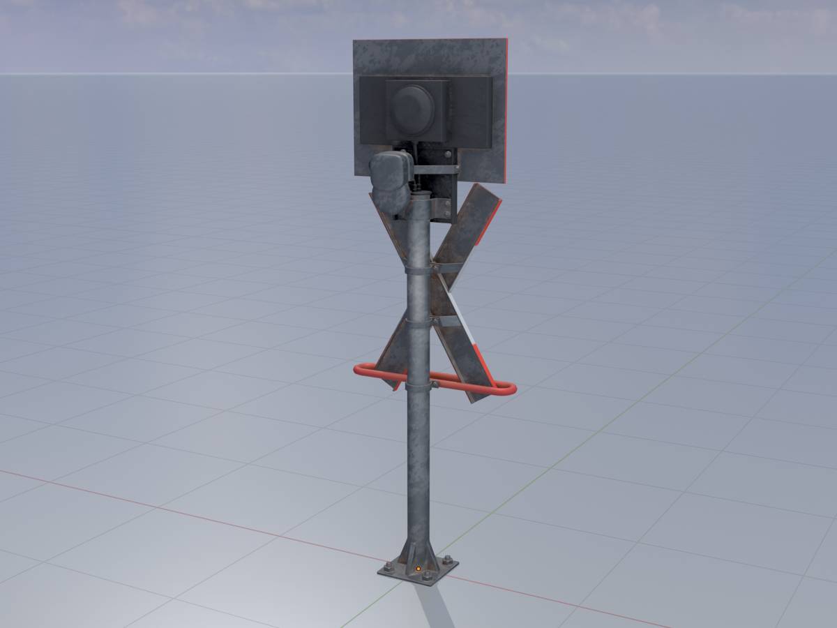 Here you can see a 3D model of a railway crossing traffic light with integrated red flashing light. The 3D model has a height of 2.70 metres measured from the ground and is modelled on reality.