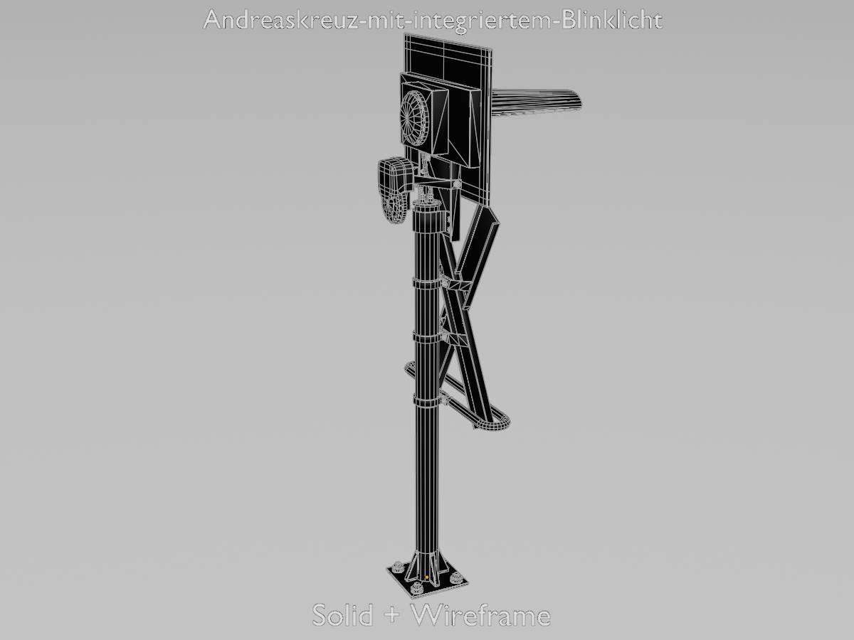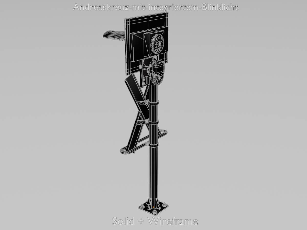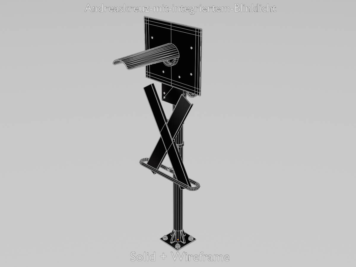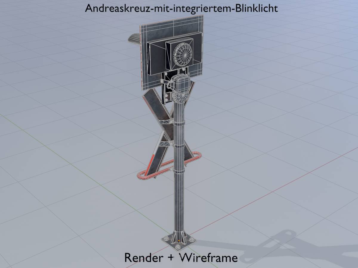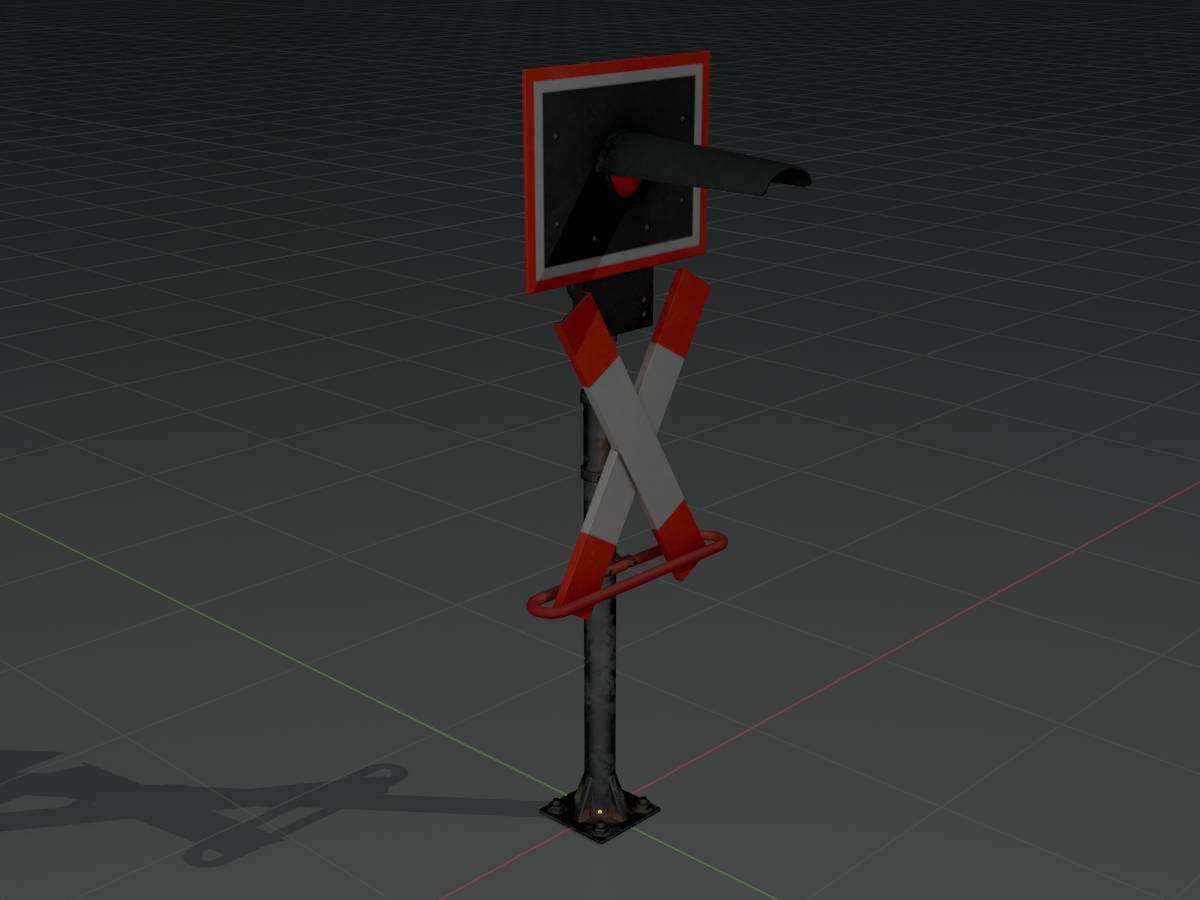 Here you can see a 3D model of a railway crossing traffic light with integrated red flashing light. The 3D model has a height of 2.70 metres measured from the ground and is modelled on reality.