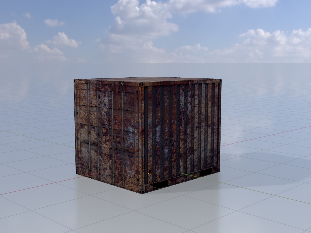 Hier sehen Sie ein 3D-Modell eines 6 Fuß langen Schiffscontainers in Rostoptik.