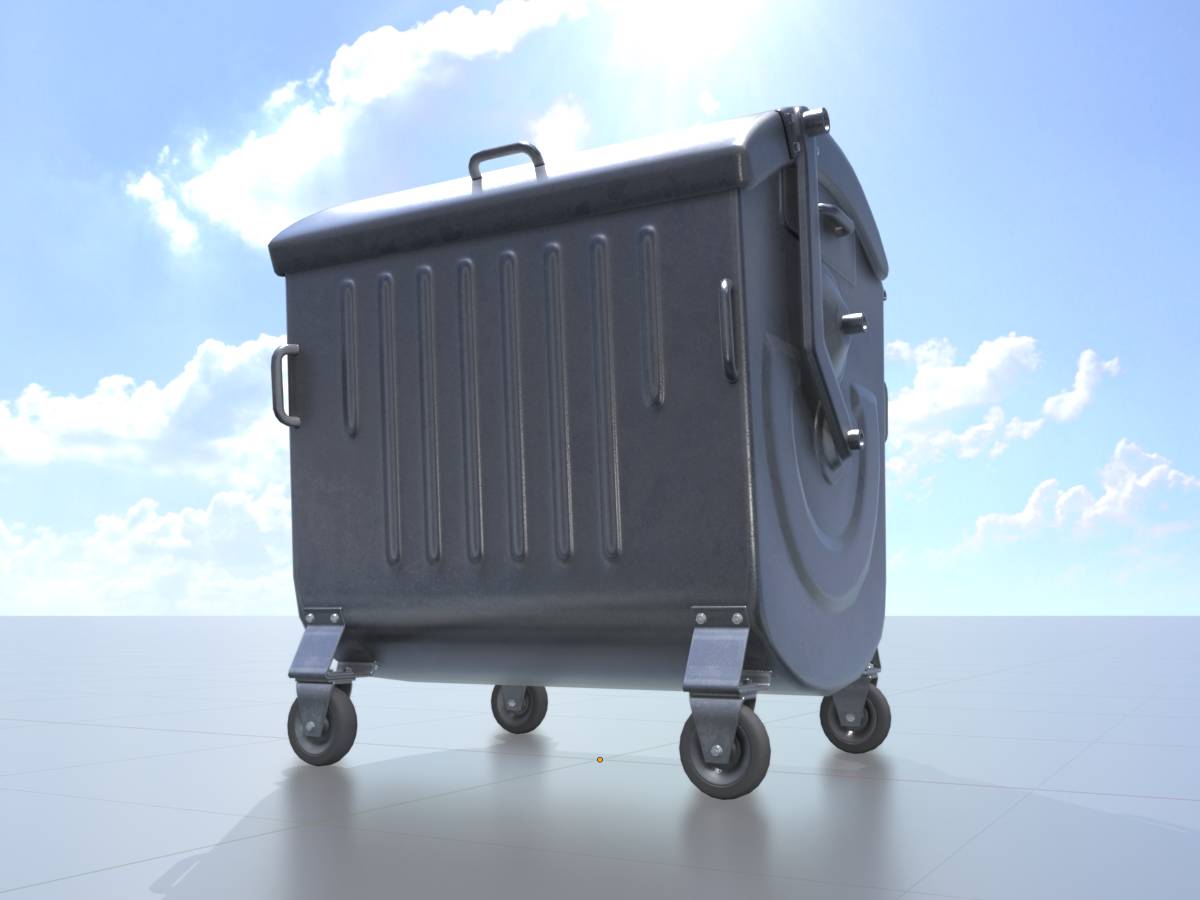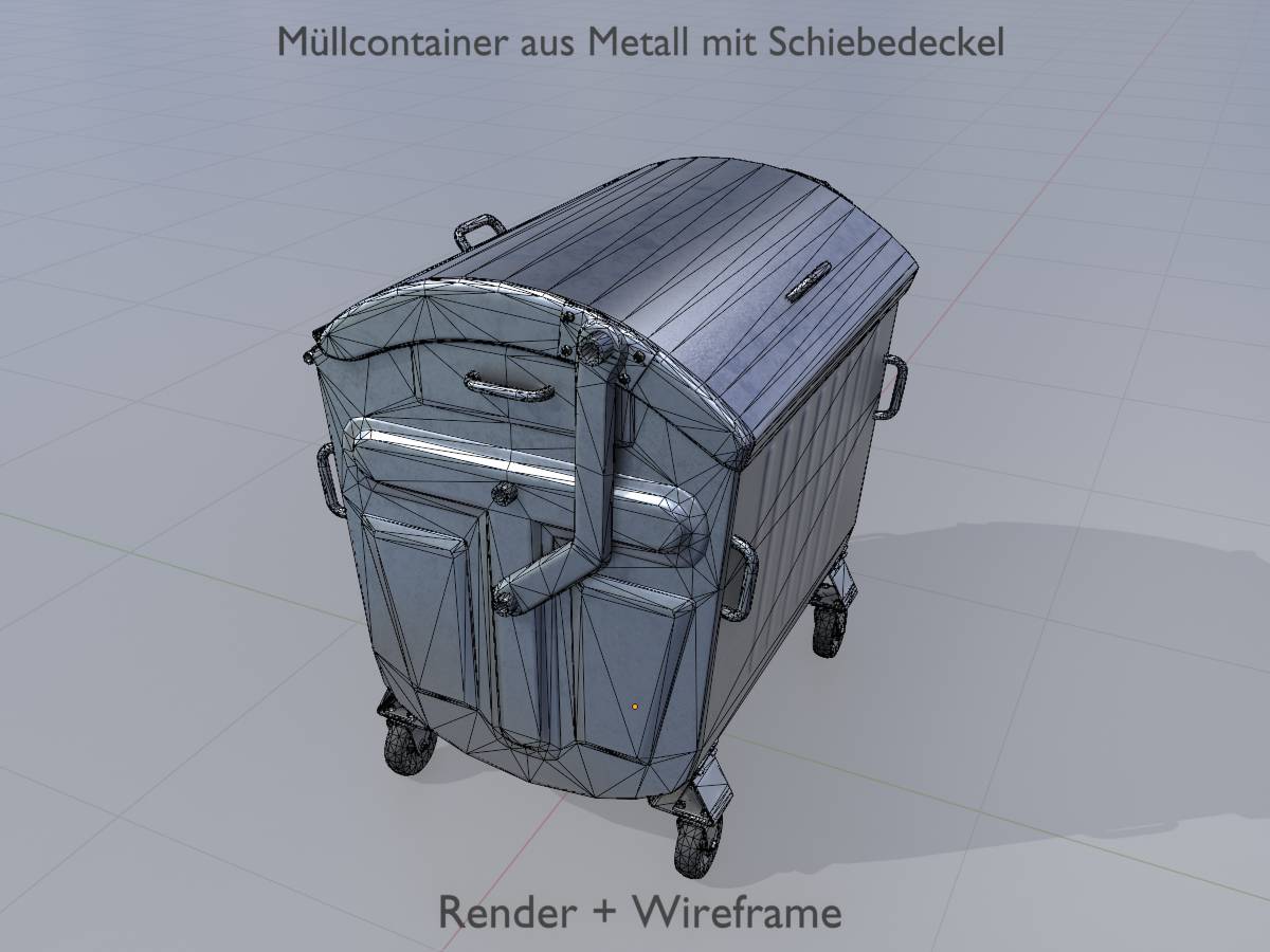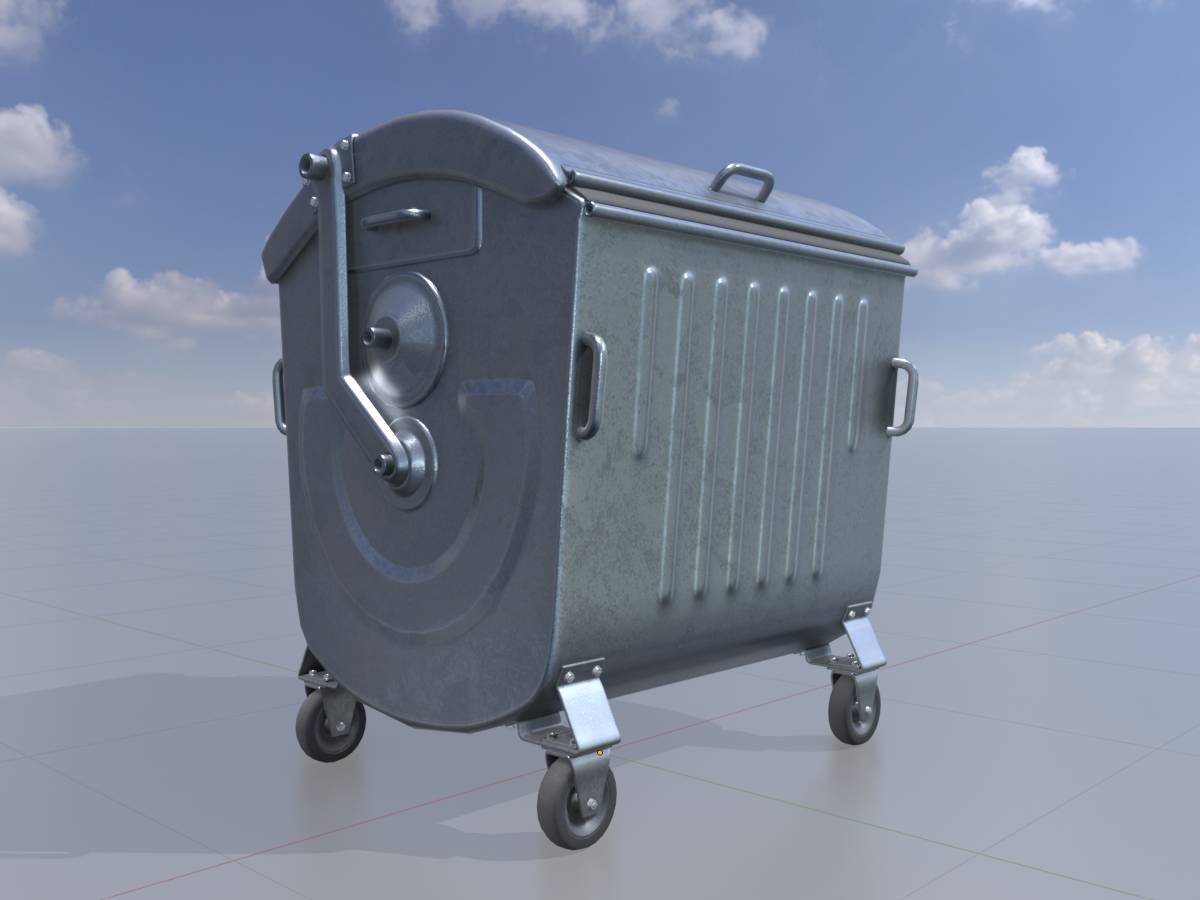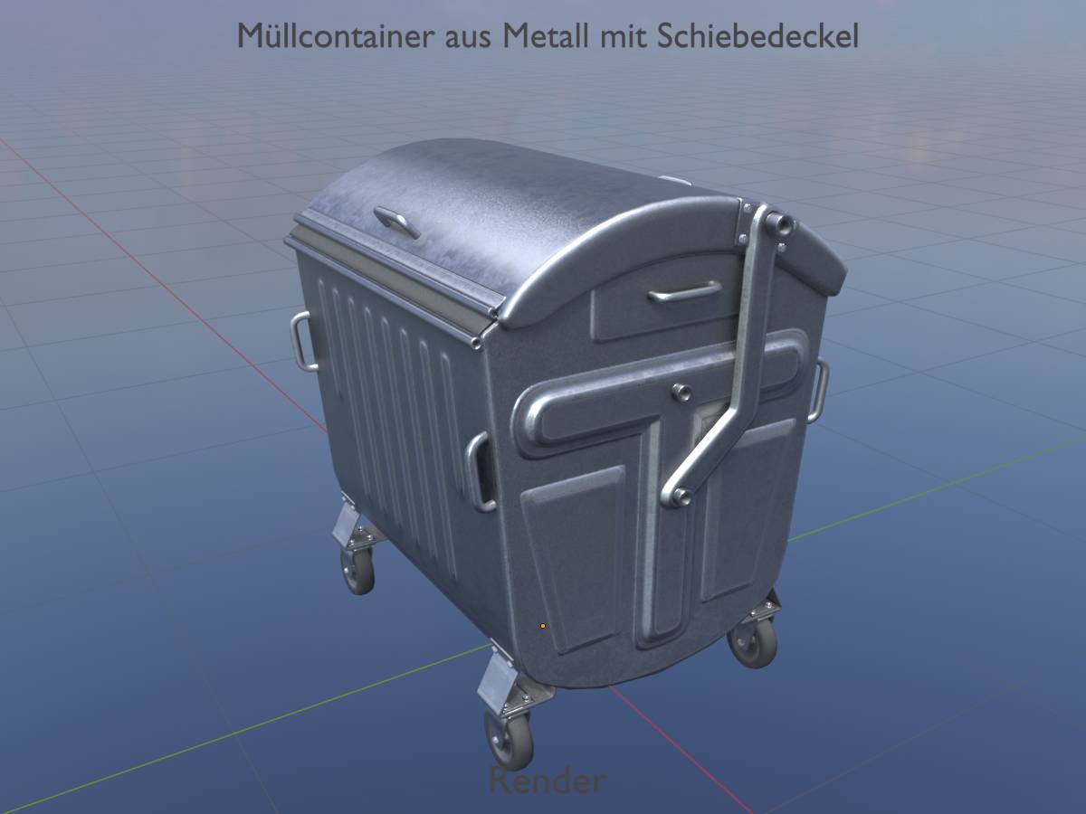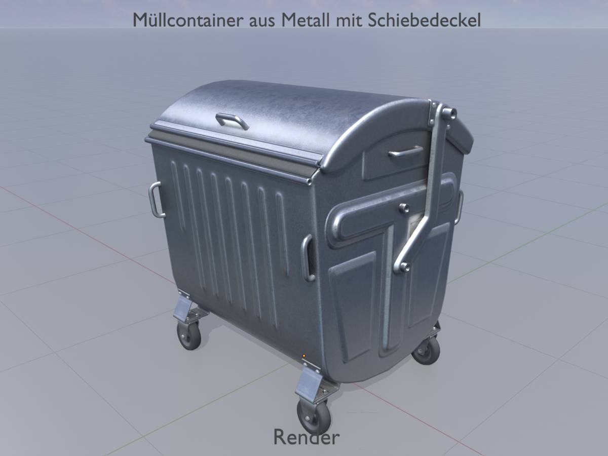 Hier ist ein 3D-Modell eines Müllcontainer aus Metall mit Schiebedeckel. Das 3D-Modell ist der Realität nachempfunden und hat eine Höhe von 1,47 Metern.