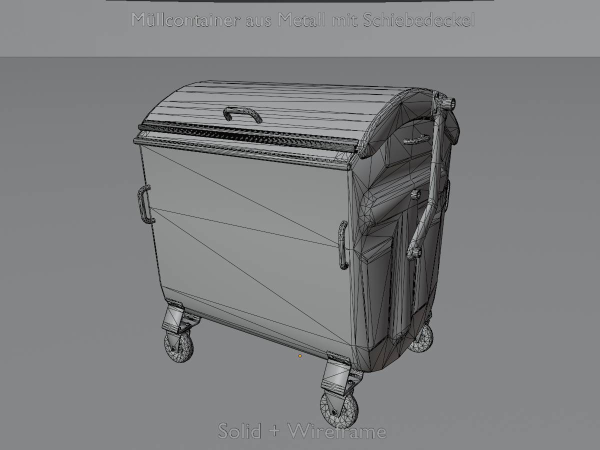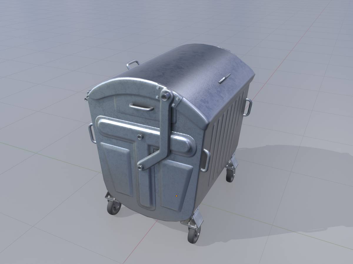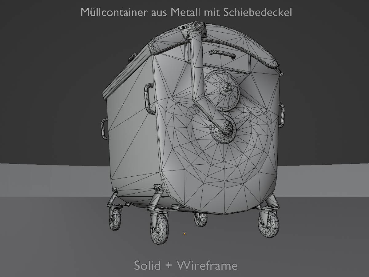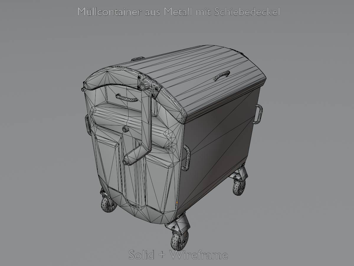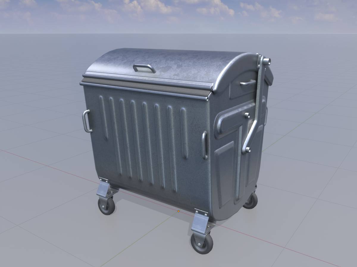 Hier ist ein 3D-Modell eines Müllcontainer aus Metall mit Schiebedeckel. Das 3D-Modell ist der Realität nachempfunden und hat eine Höhe von 1,47 Metern.