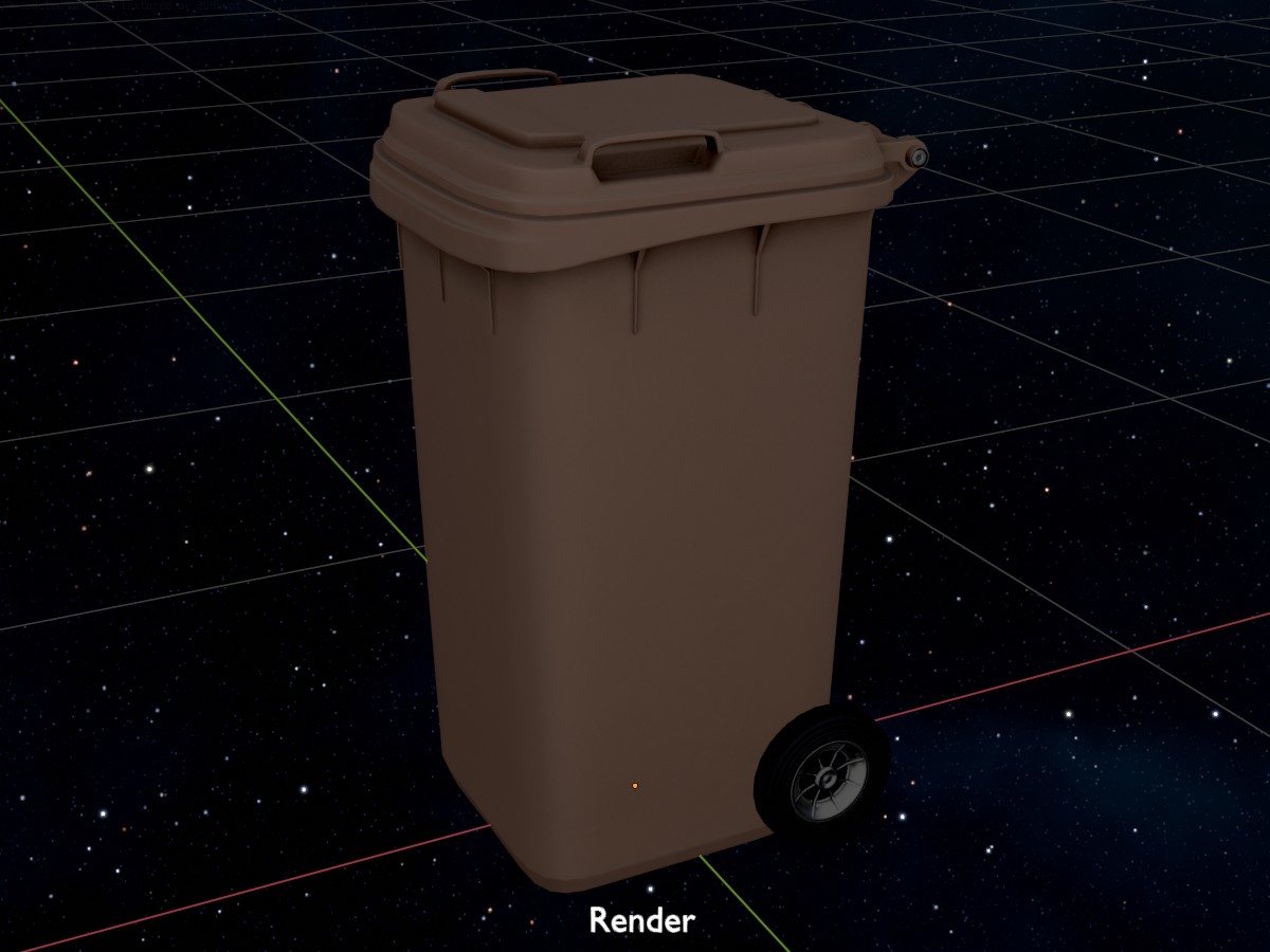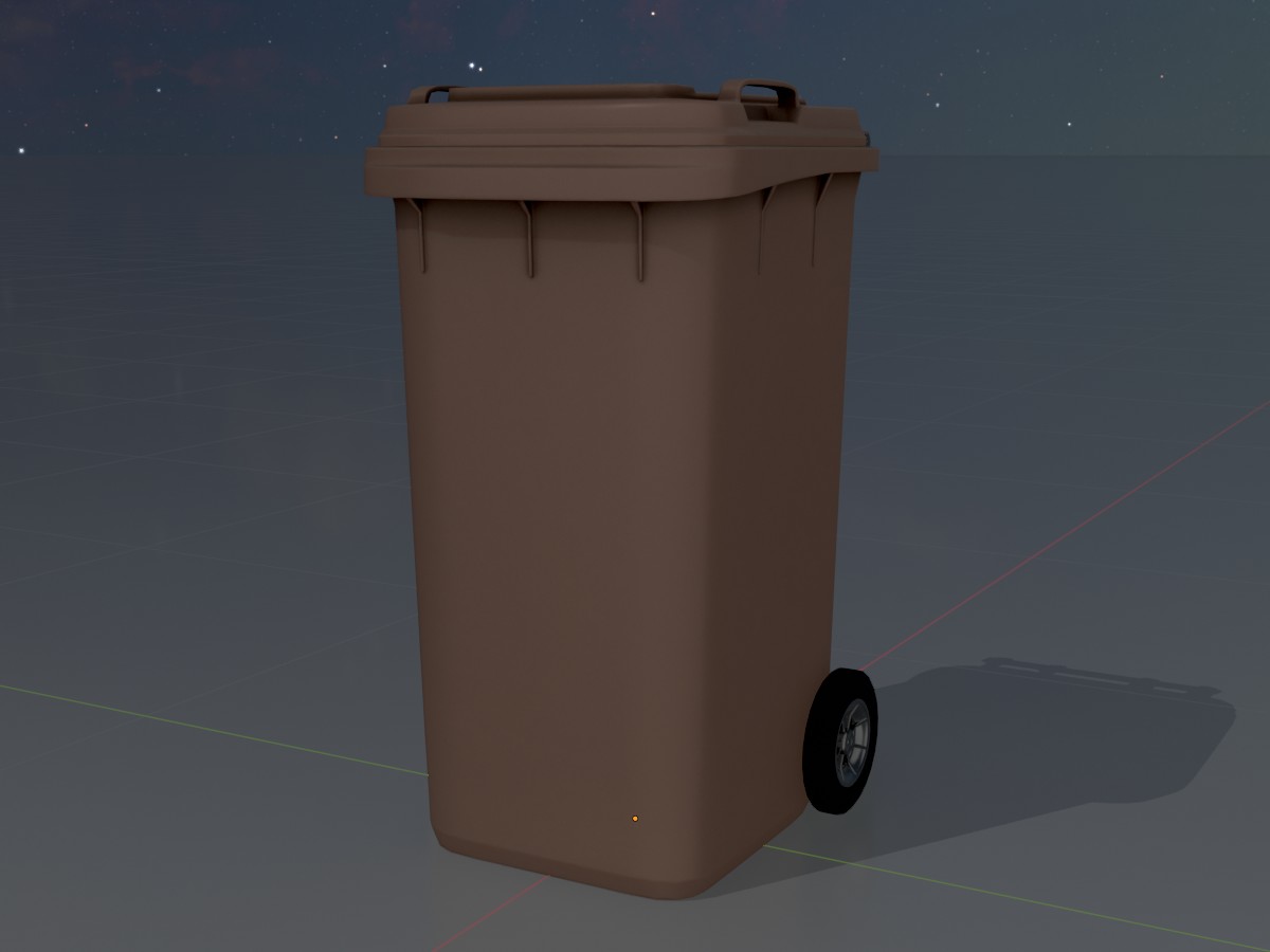 Hier sehen Sie ein 3D-Modell einer braunen Kunststoff-Mülltonne mit Rädern und einem Fassungsvermögen von 240 Litern.