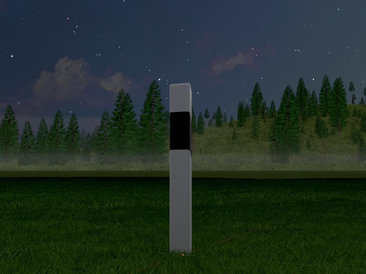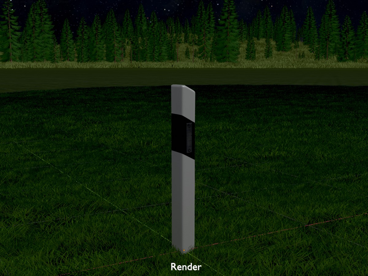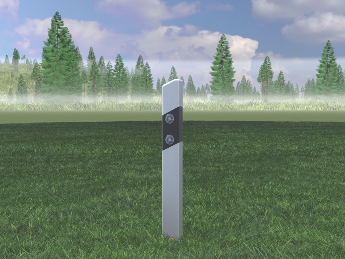Hier sehen Sie ein 3D-Modell eines Leitpfostens mit weissen Reflektoren für den linken Fahrbahnrand.