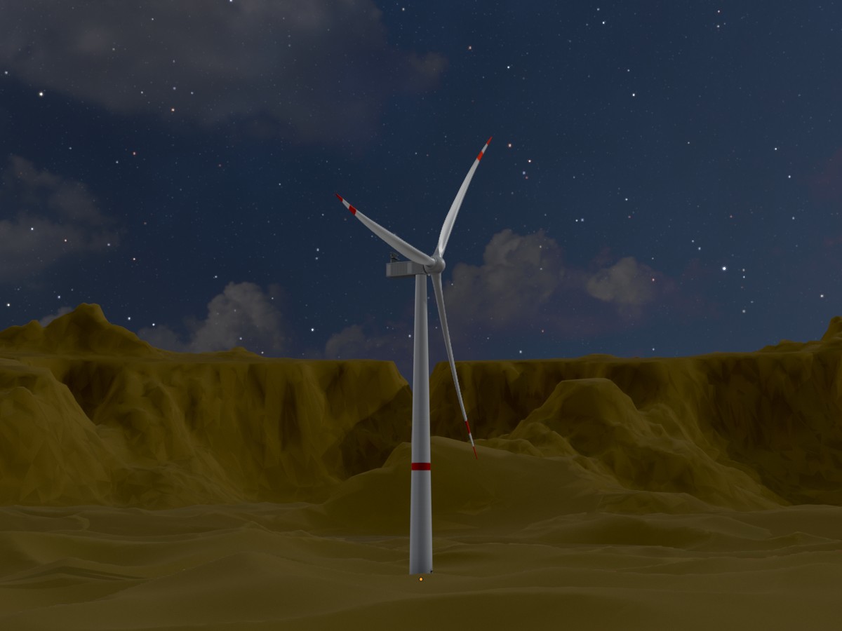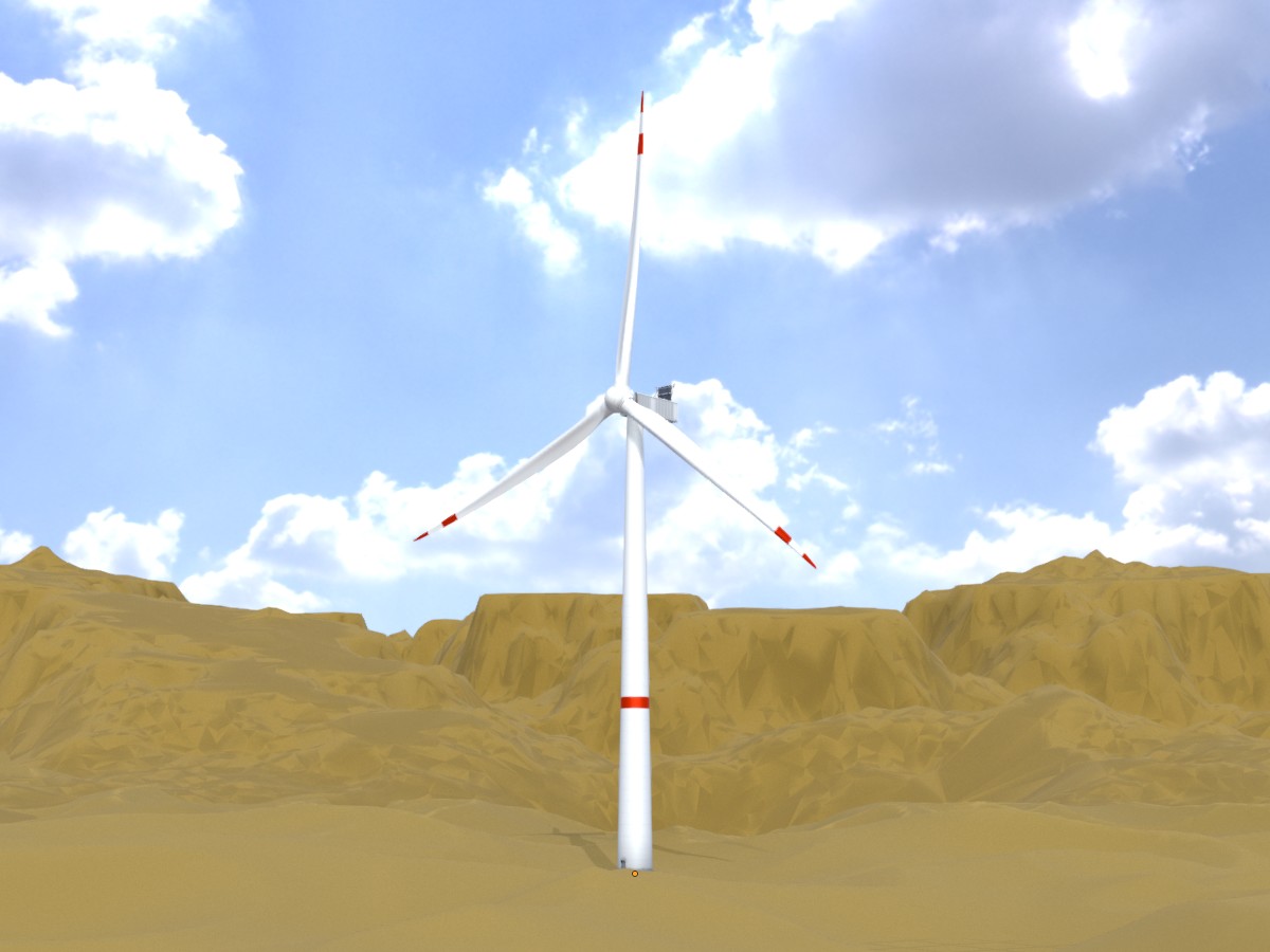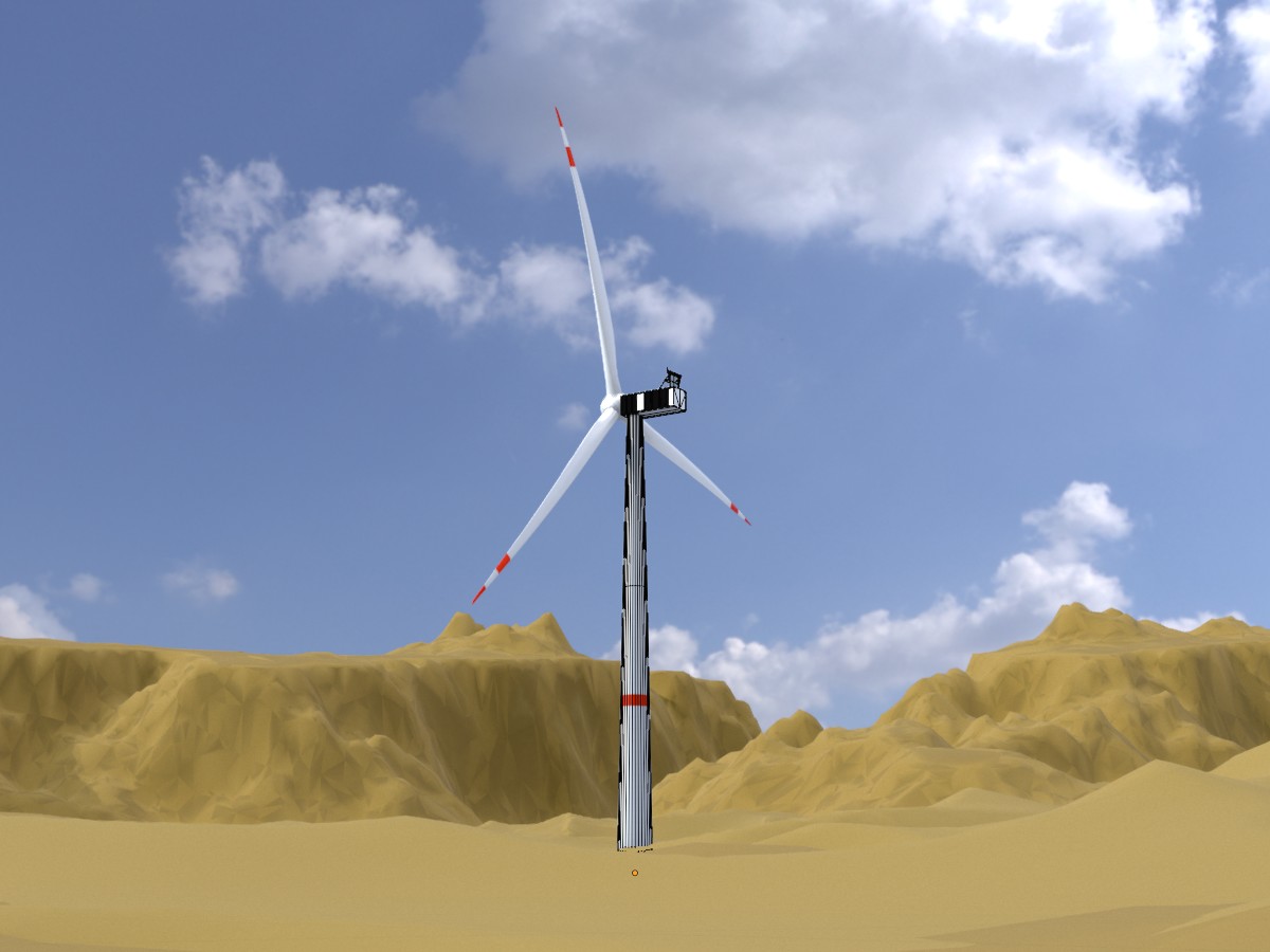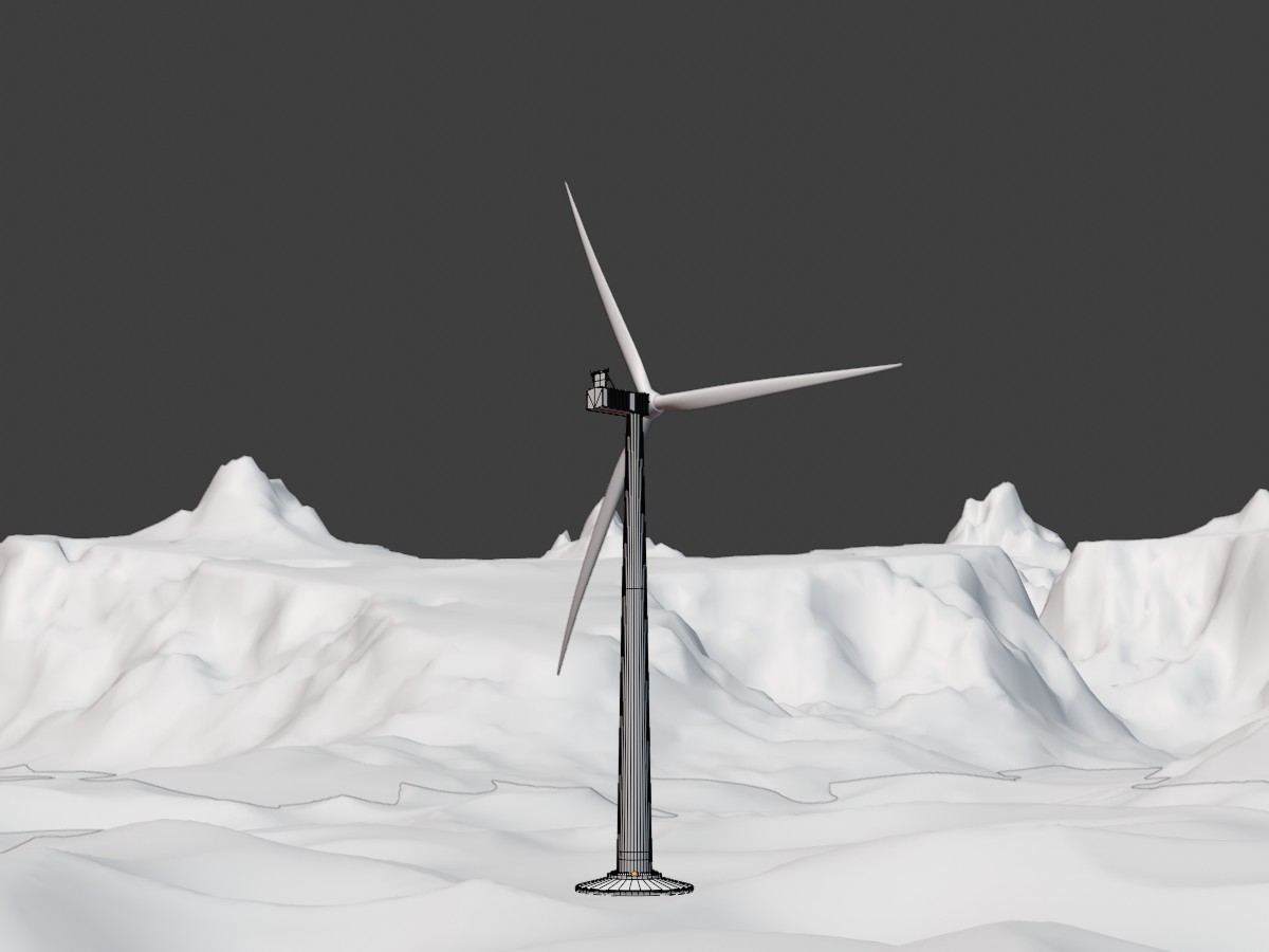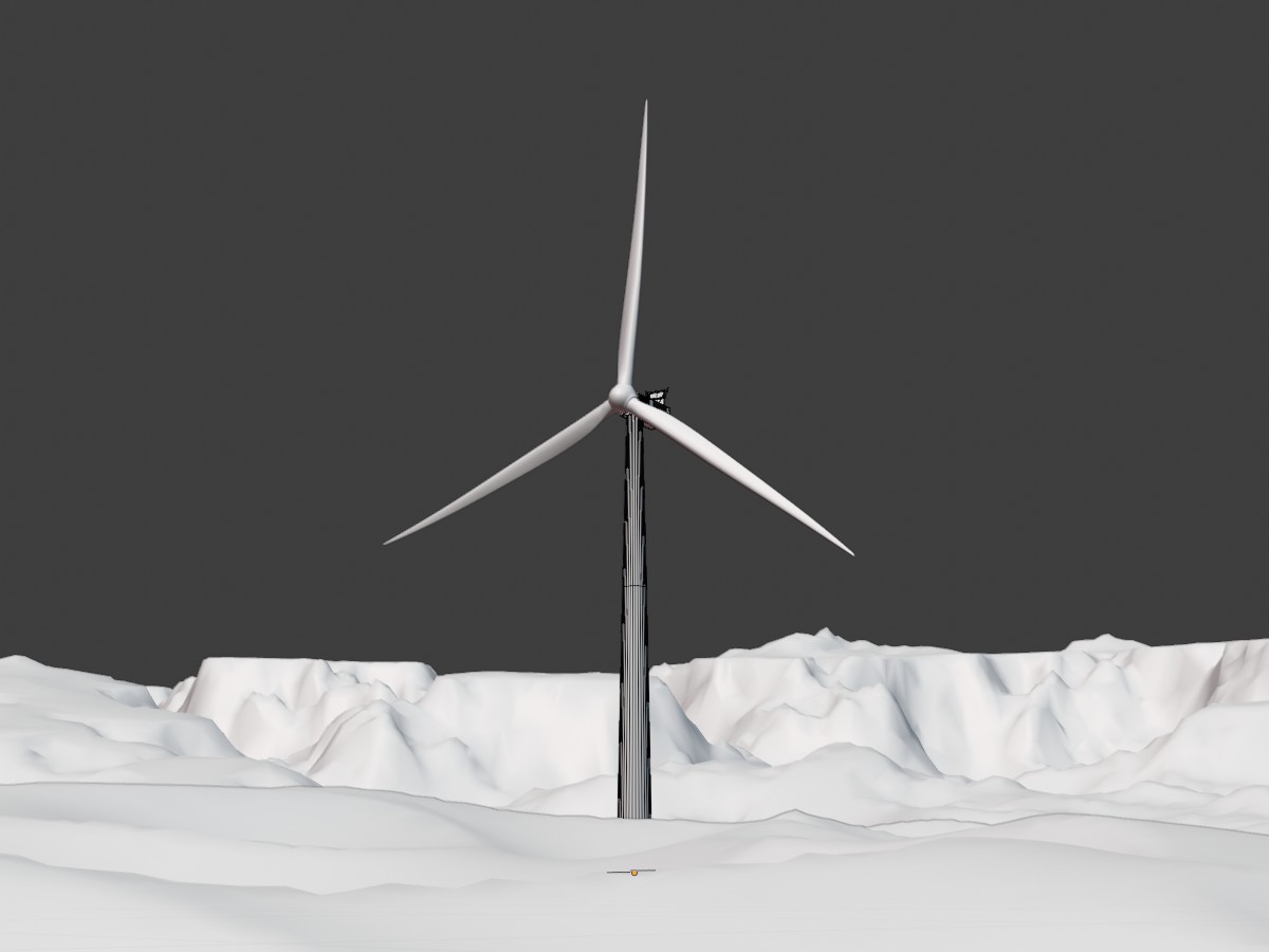 Hier sehen Sie ein 3D-Modell der Windkraftanlage Version V1 mit Fundament und einem Rotordurchmesser von 160 Metern.