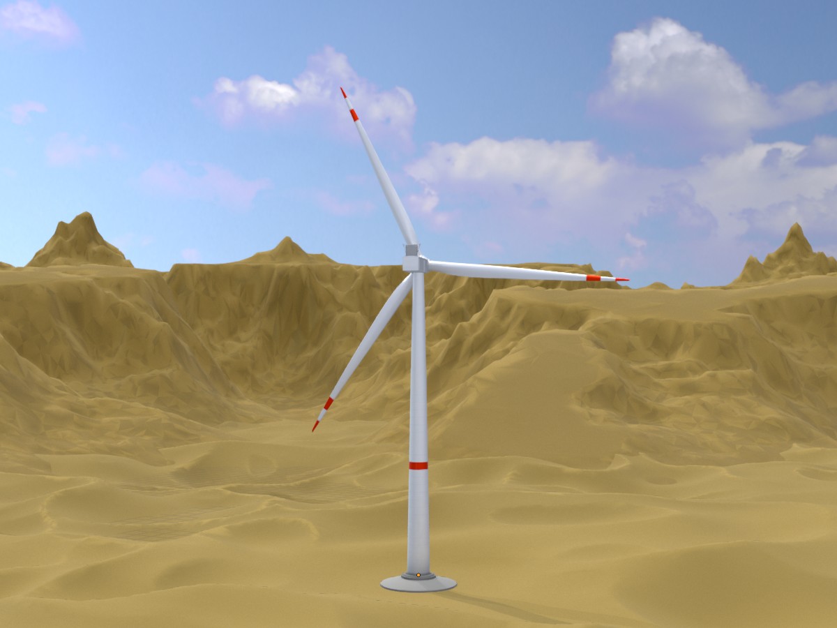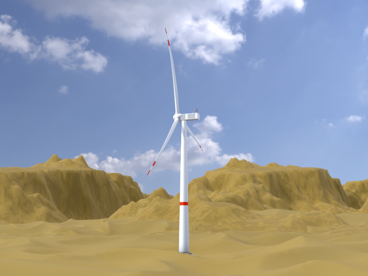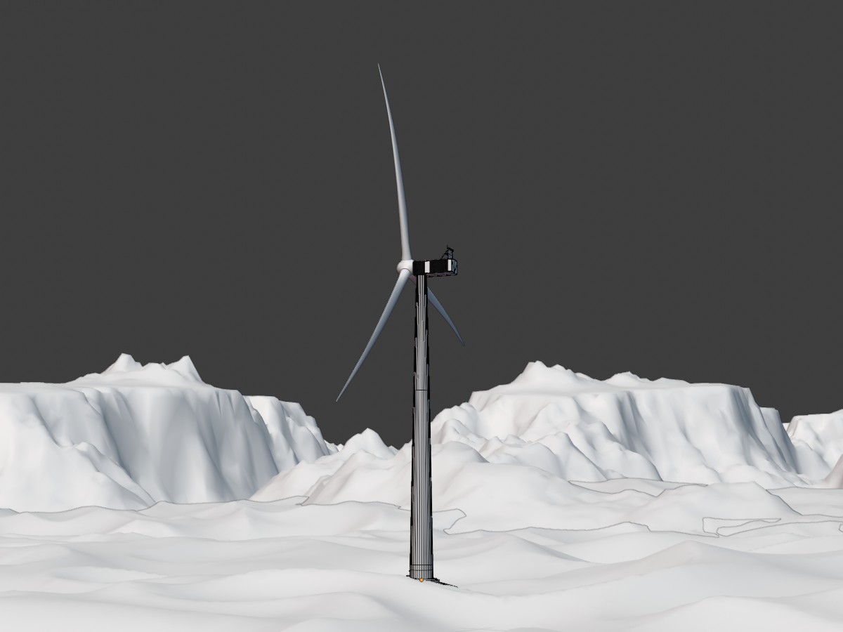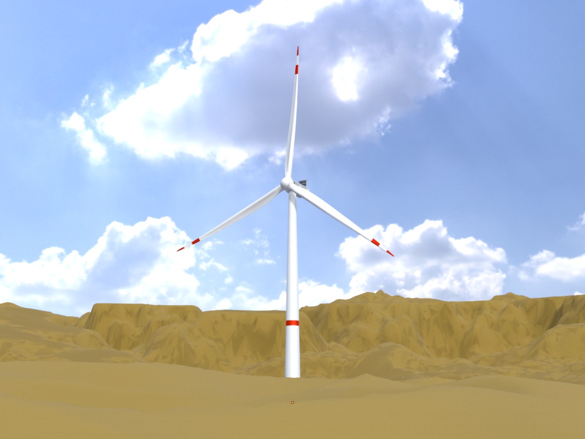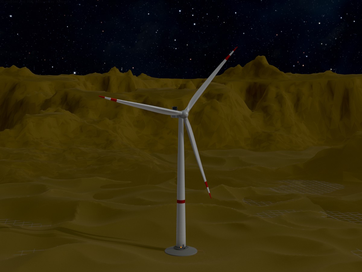 Hier sehen Sie ein 3D-Modell der Windkraftanlage Version V1 mit Fundament und einem Rotordurchmesser von 160 Metern.